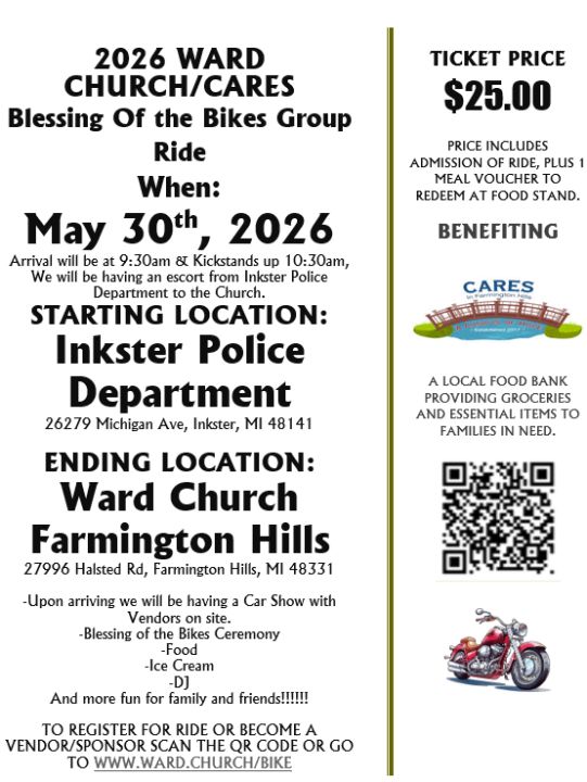 This will also be the first year for us hosting an escorted group ride!!!! All details of the ride are listed below, and the ride will be starting from Inkster Police Department and all who are interested in joining are encouraged to Register online at www.ward.church/bike or at the police department the morning of the ride.